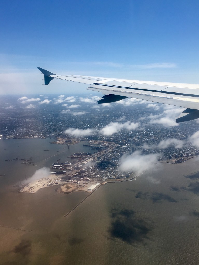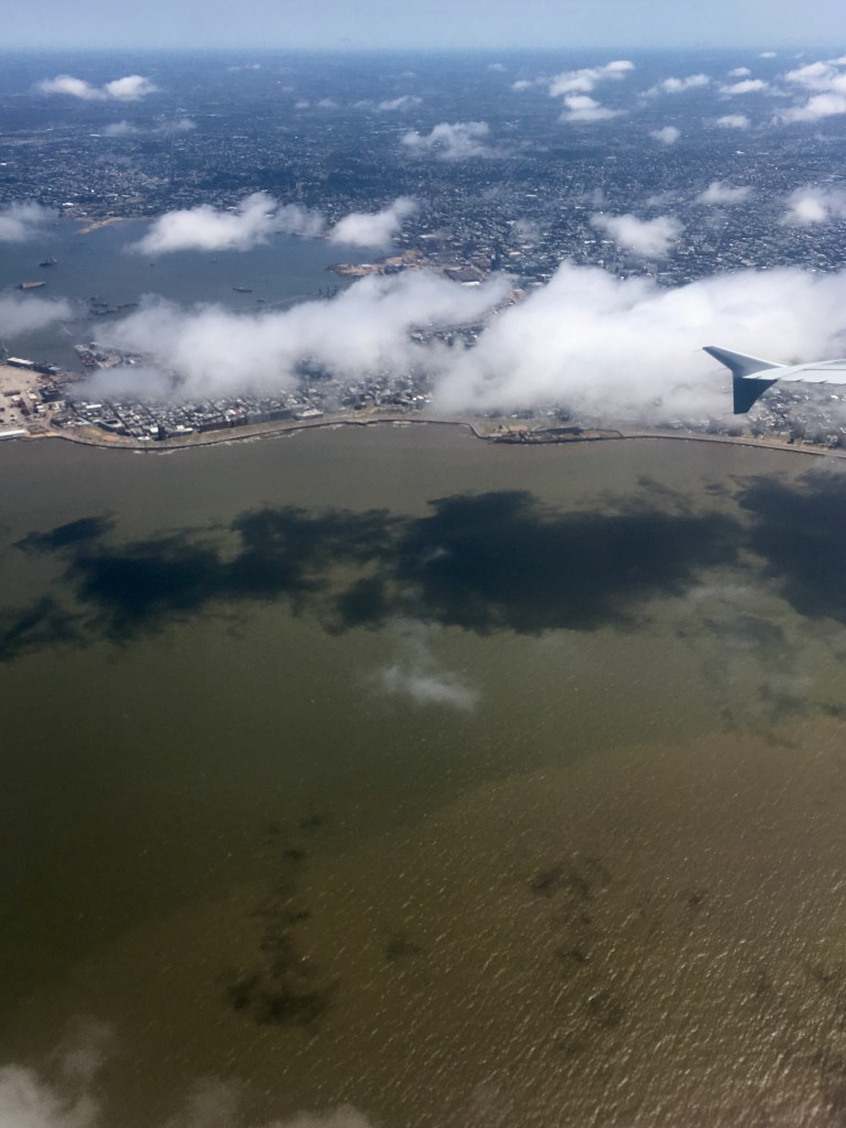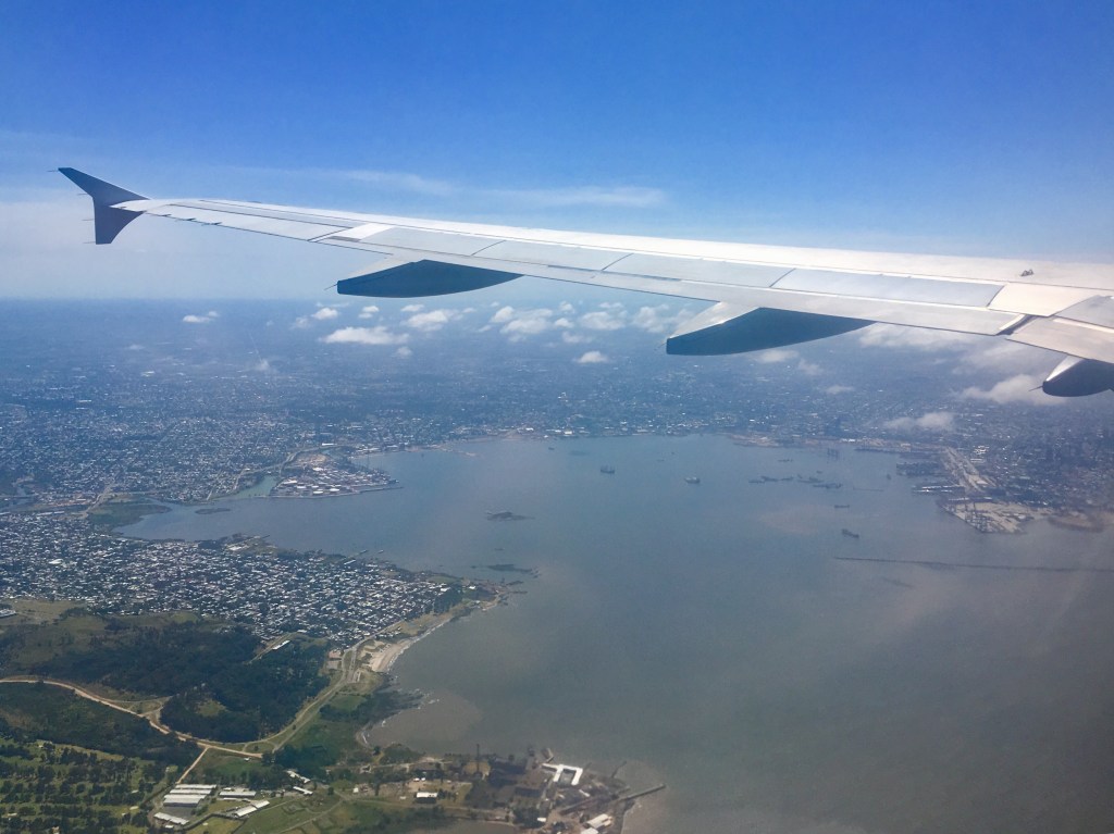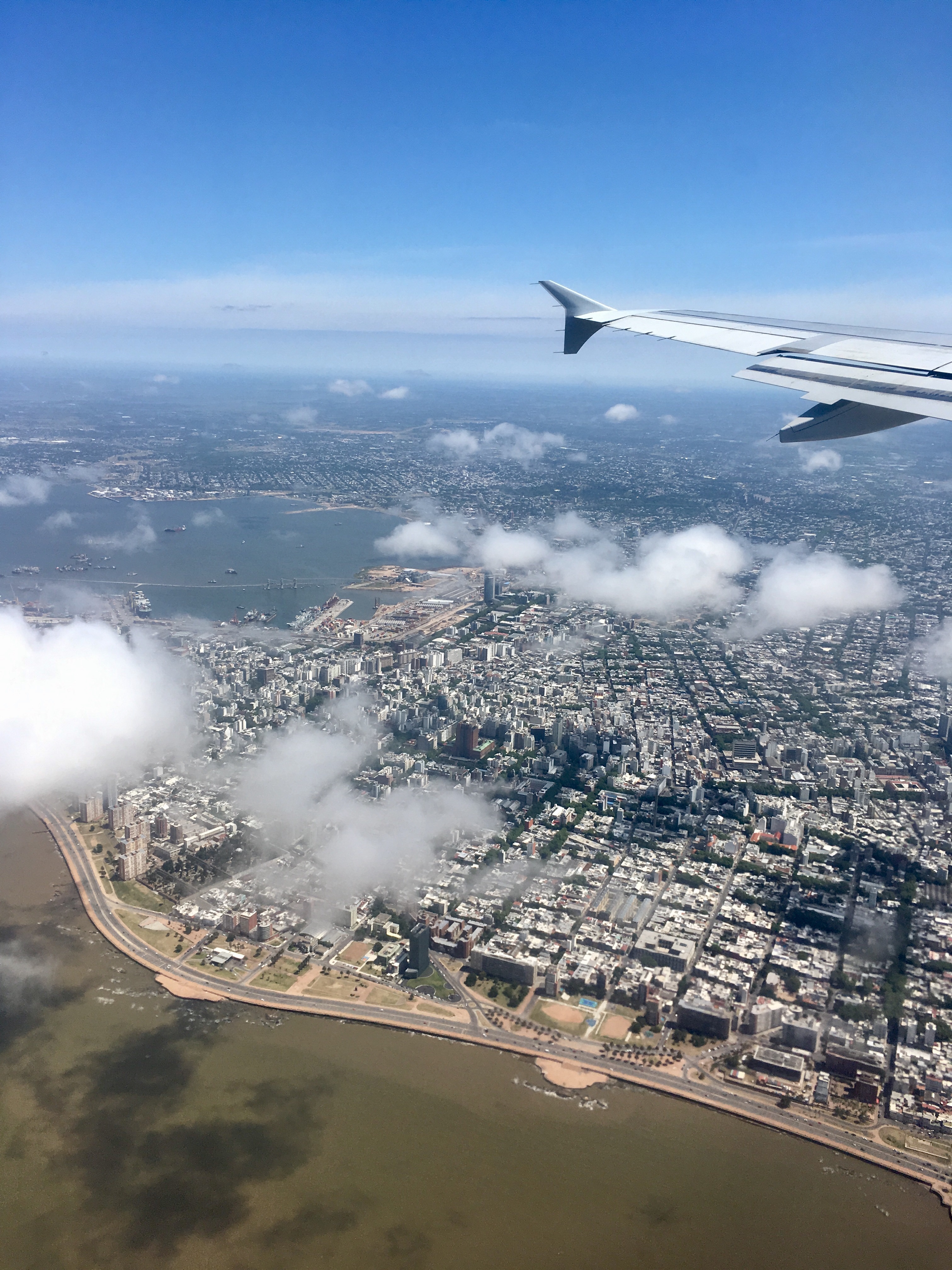 Mi avión decidió que iba a llegar a Montevideo desde el oeste. Así que cuando el horizonte se empieza a poblar de edificios, lo primero que ves de la ciudad es su punto más alto –en la imagen, la franja verdosa abajo a la izquierda–: el Cerro de Montevideo. Son apenas 134 metros de altura, pero en un país irreverentemente plano, se trata de toda una institución.