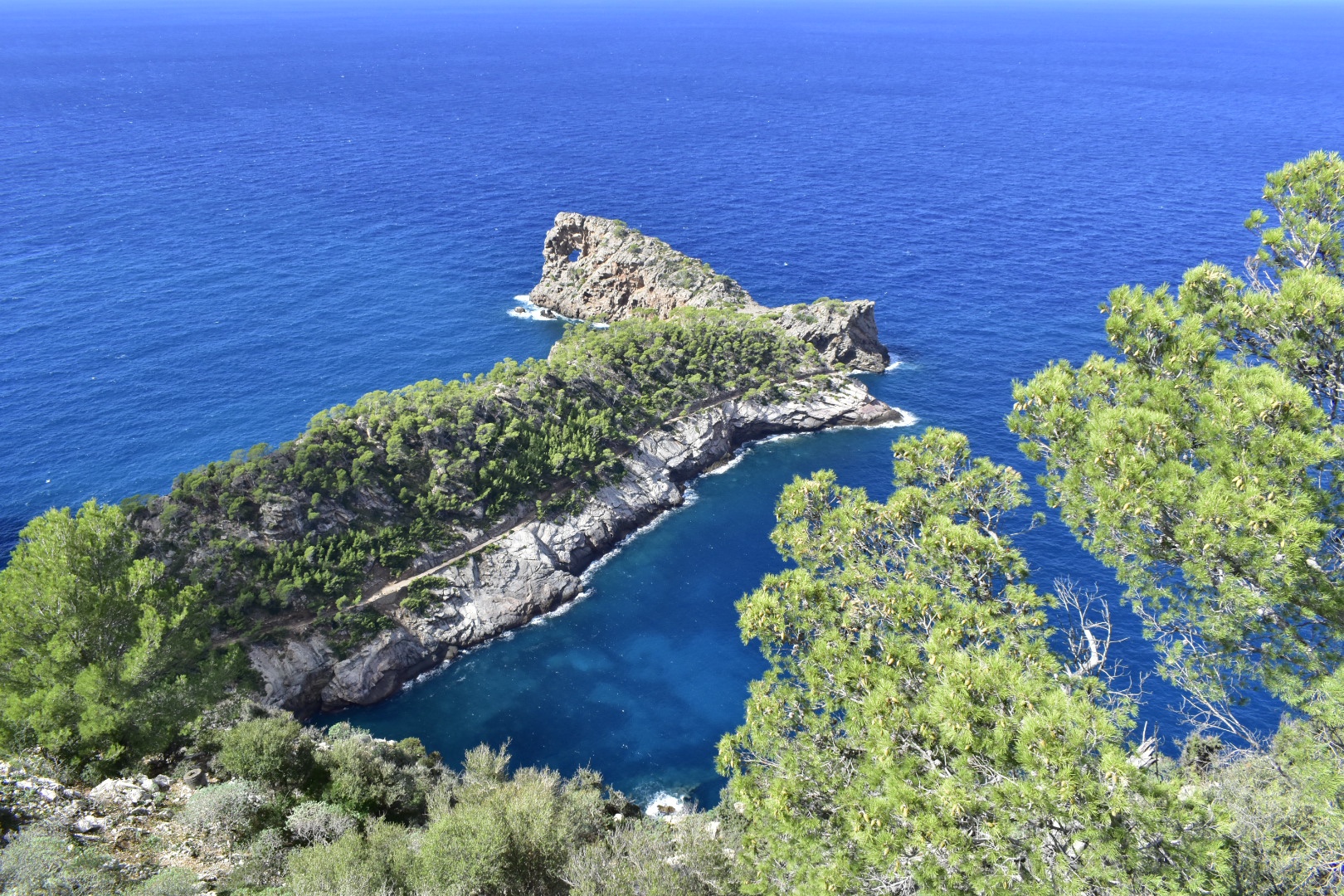 A los pocos minutos nos desviamos y aparcamos en el estacionamiento de Son Marroig y, al cabo de medio minuto a pie, nos topamos con el mirador de Sa Foradada. Bajo nuestros pies, a algún centenar de metros de distancia, todos los tonos de azul posibles. Y una península estrecha y caprichosa que dibuja una enorme roca que, en uno de sus extremos, está agujereada. Es el gran forat por el que, según dicen, se cuela la mejor puesta del sol de la isla.