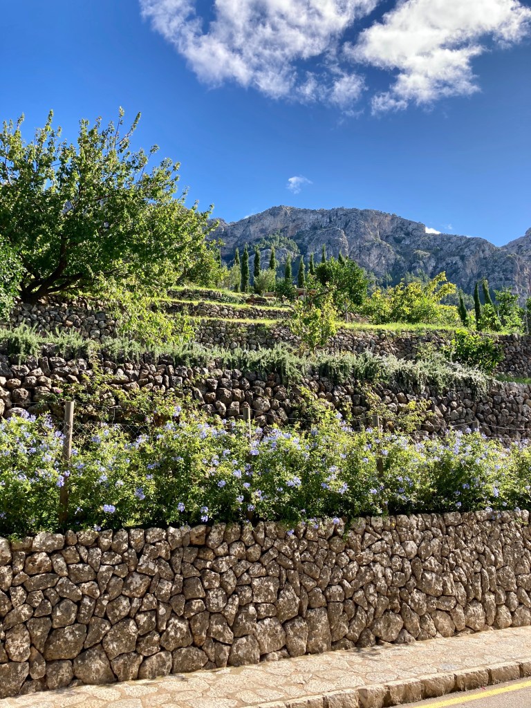 Empiezan las curvas –vendrán varios centenares de ellas–, y el camino inicia un estrechamiento progresivo. A ambos lados de la carretera se empieza a ver algo tan característico de la Serra de Tramuntana como la ensaimada lo es a Mallorca: una sucesión perfectamente escalonada de cultivos delimitados por las ancestrales terrazas que, gracias a la pedra en sec y al sistema de aljibes y canales que riega los valles, han alimentado a tantas generaciones de mallorquines y mallorquinas.