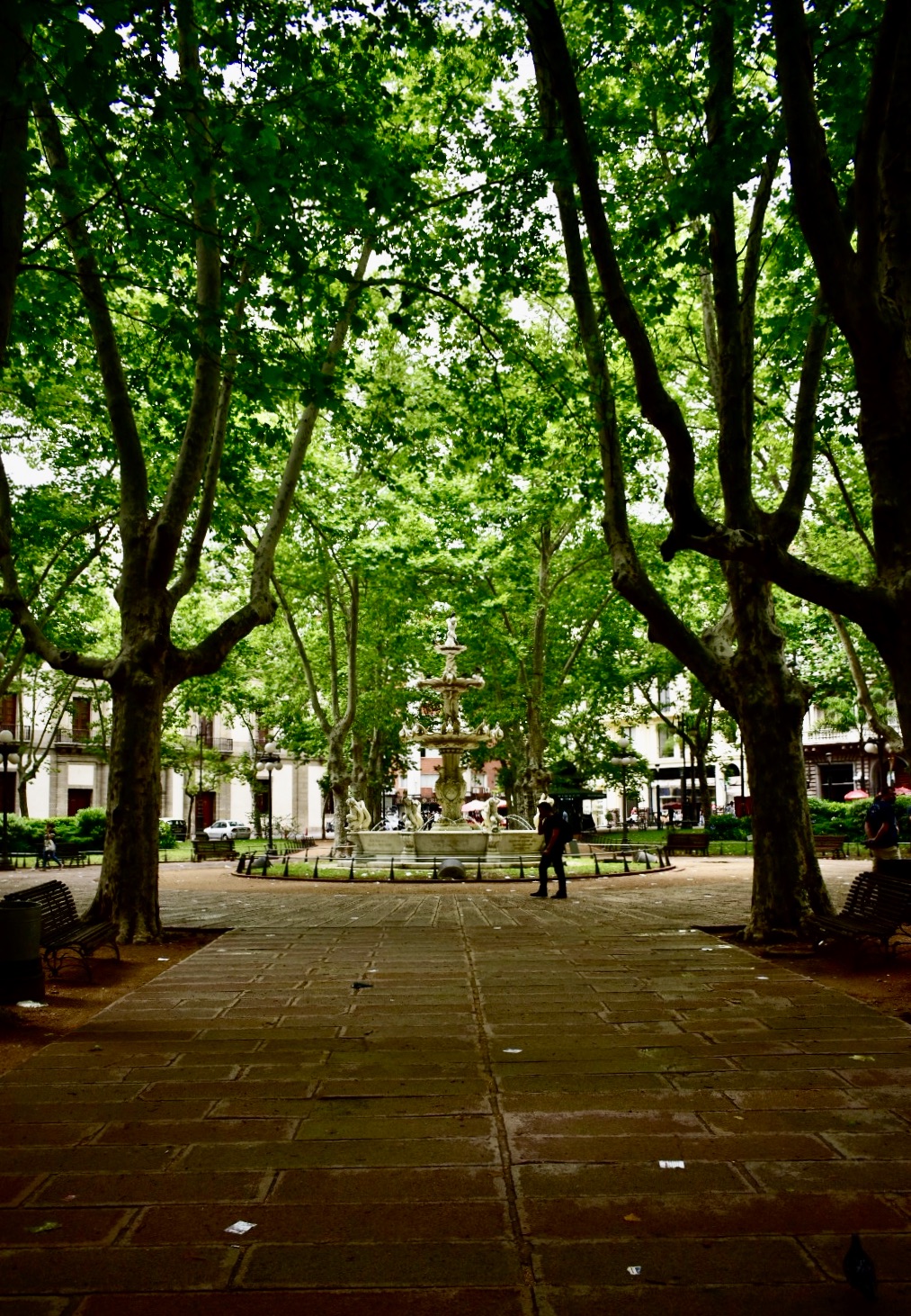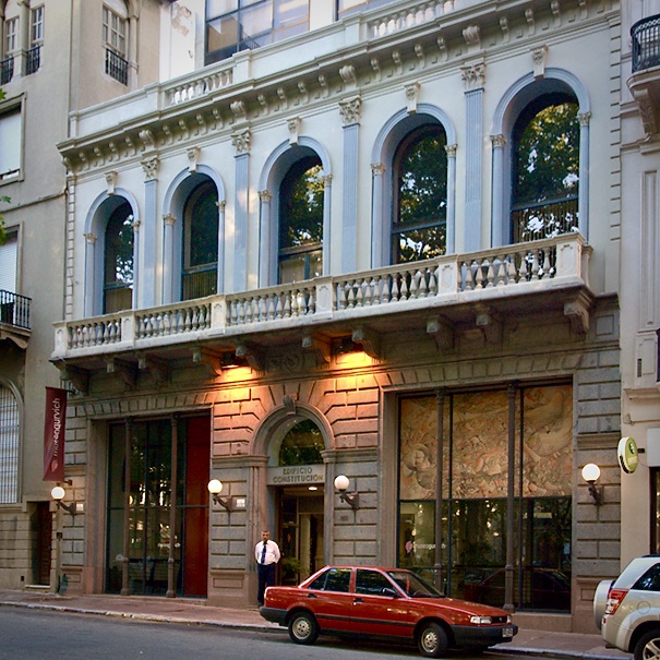 A la Plaza Constitución le llaman Plaza Matriz. Cosas de las ciudades viejas: a veces los nombres oficiales no coinciden con los que le ha acabado dando su gente. ‘Matriz’, porque en ella encuentras edificios de los que emanó y emana poder: la catedral montevideana, el Cabildo de la ciudad, el Ministerio de Transportes y Obras Públicas, el Club Uruguay, epicentro de los encuentros de la alta burguesía desde finales del siglo XIX… Plataneros de más de 30 metros los custodian, y ordenan los caminitos que rigen la plazoleta, elegante y armoniosa, y conducen a la fuente del centro.