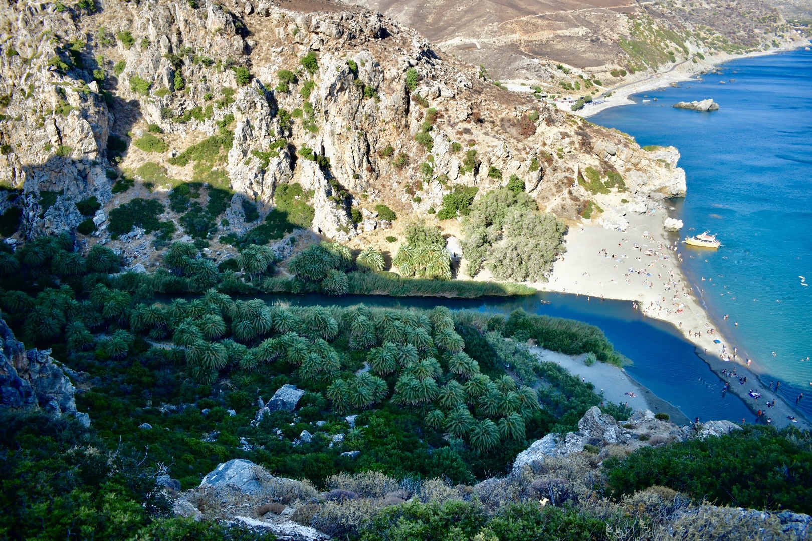 Atravesando la isla de norte a sur —y sus densísimas montañas y olivares— y tras probablemente tres millones de curvas, te presentas en la antesala de la playa de Preveli: una escena tan épica como remota y singular; un paisaje que parece sacado de la misma Biblia.