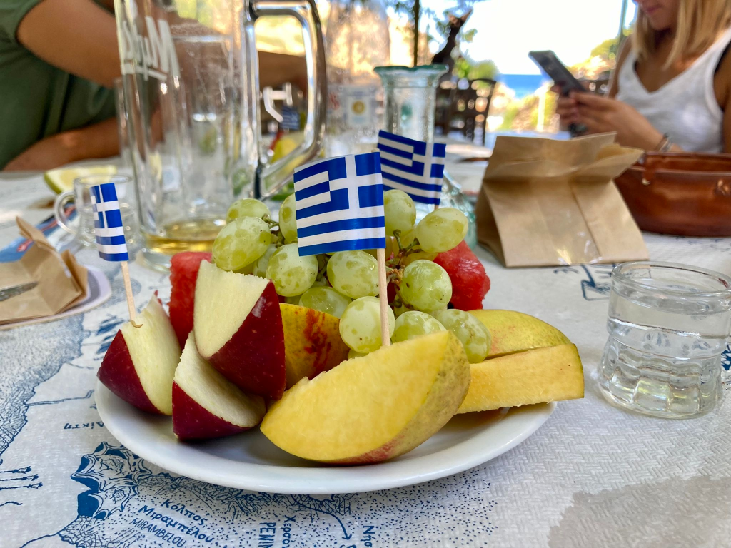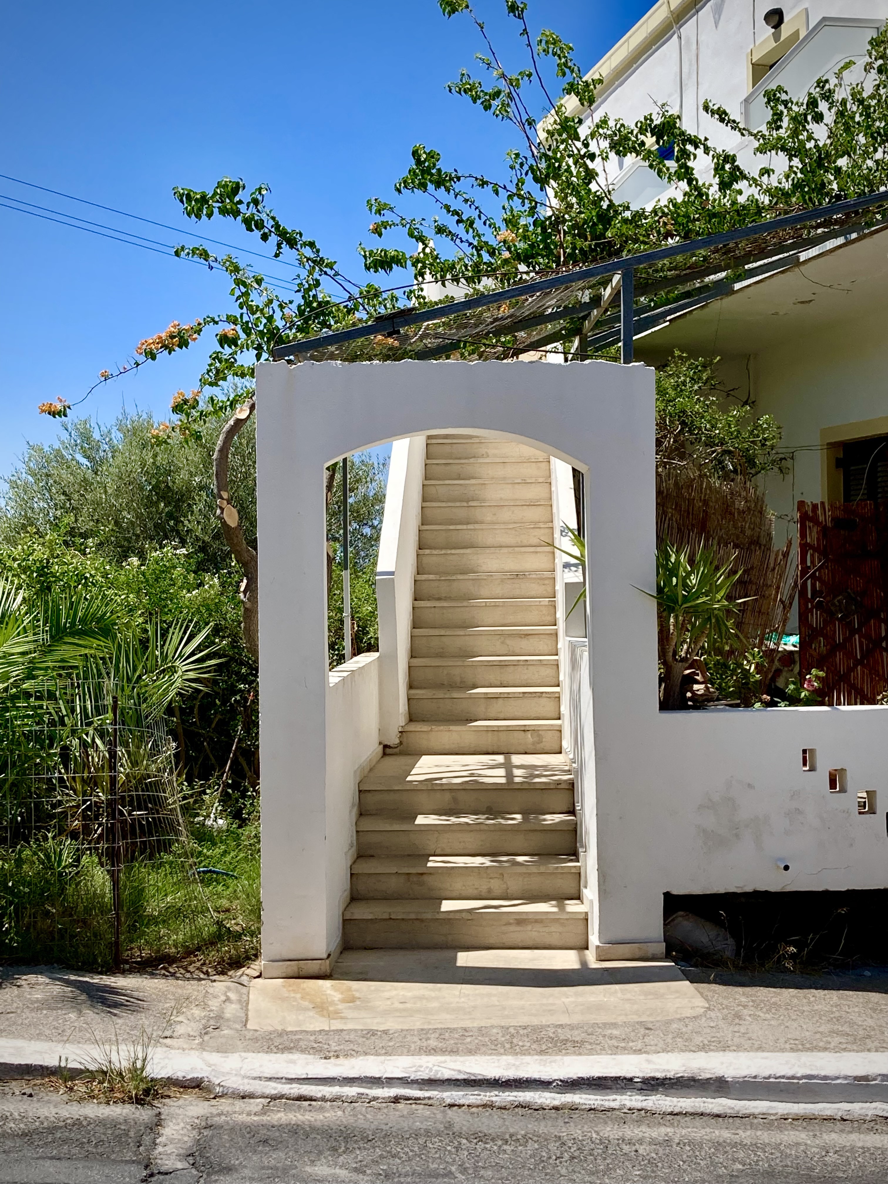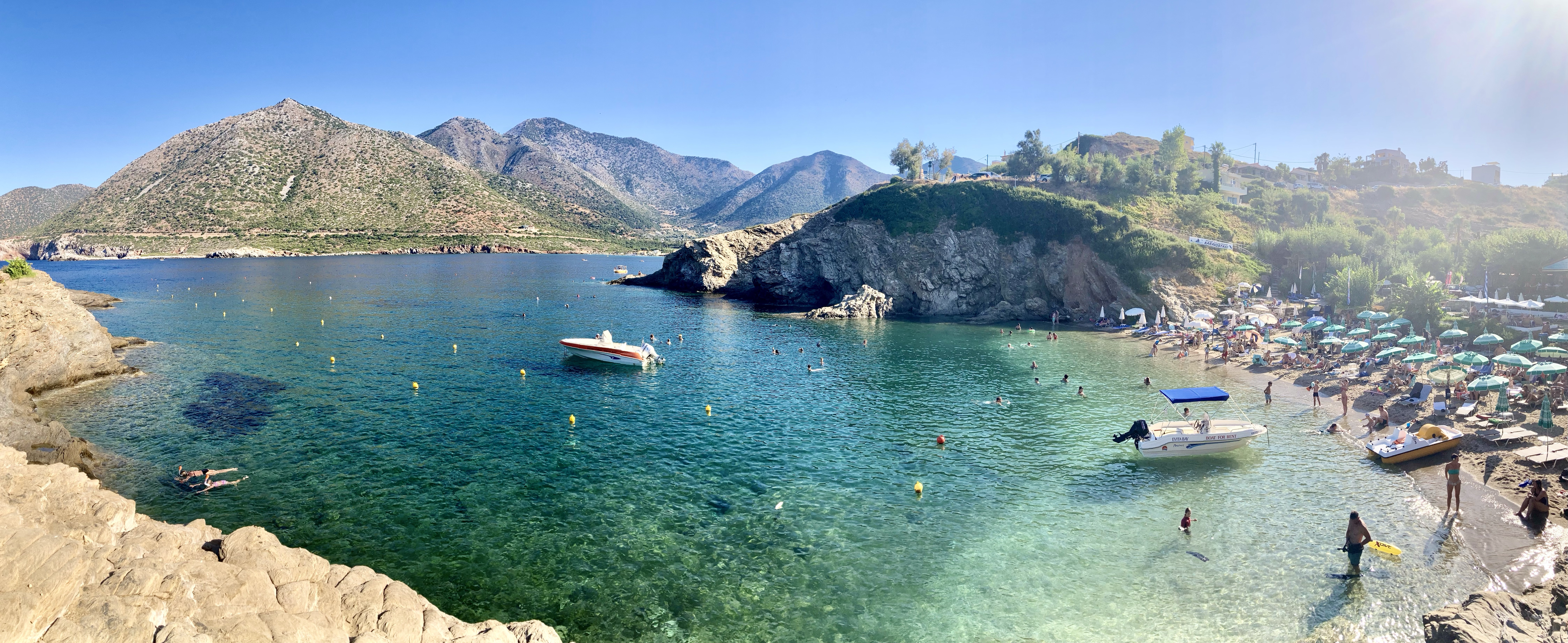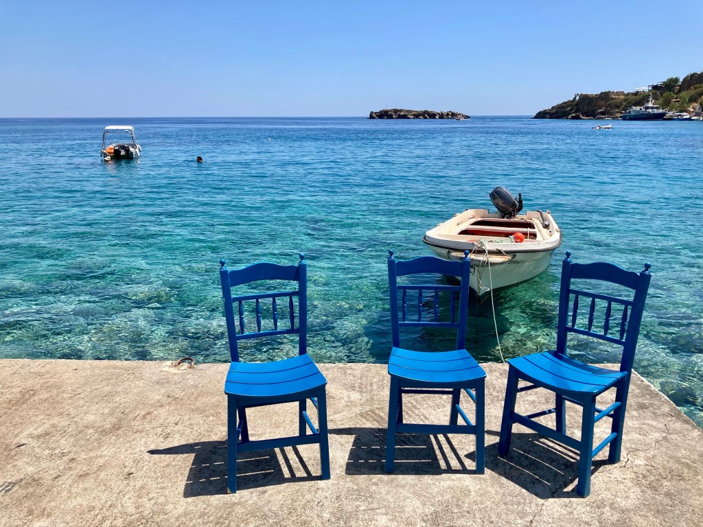 Primera lección: en Creta, difícilmente se aparca a pie de playa —cosas de la geografía—, pero eso, a la postre, siempre es un regalo. En este caso, camino hacia el agua, nos topamos de frente con la única taberna del lugar, un típico kafeneio, con sus coloridas sillas de esparto y su generosa parra, y no pudimos sino acomodarnos bajo su sombra idílica. Y segunda lección —esta, al son de las chicharras—: en Creta, las raciones son inmensas y sabrosas, la amabilidad es auténtica y desinteresada, y el raki, el aguardiante local, en pleno verano, es mágico y reponedor.