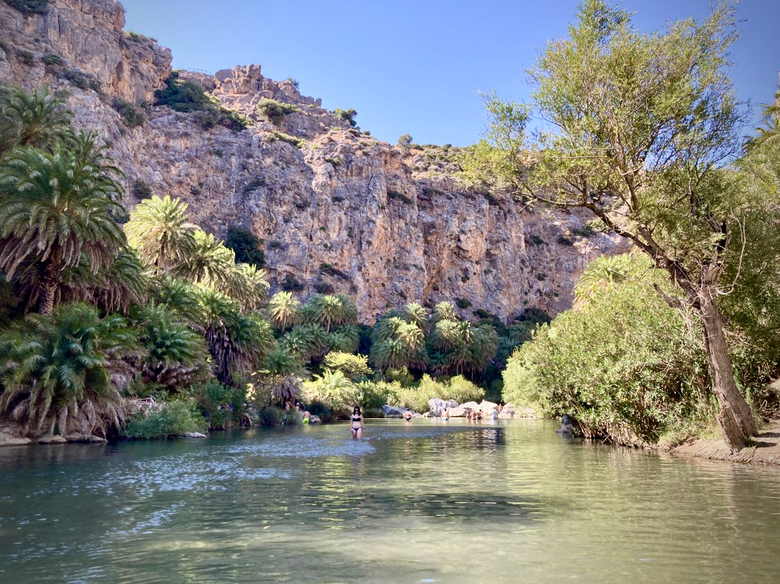 De nuevo, un acceso complejo pero benefactor: varios centenares de escaleras separan el punto de llegada de la propia playa, en un sinuoso pero precioso sendero. Frente a ti, la inmensidad azul y plácida del mar de Libia y, ante él, la propia Preveli: una playa, sí, pero también un río —el Megalopotamos— que, procedente del corazón montañoso de Creta, desemboca en el mar franqueado por un palmeral salvaje, enmarcado a la vez por altivas paredes rocosas. No, no se puede pedir más exotismo.