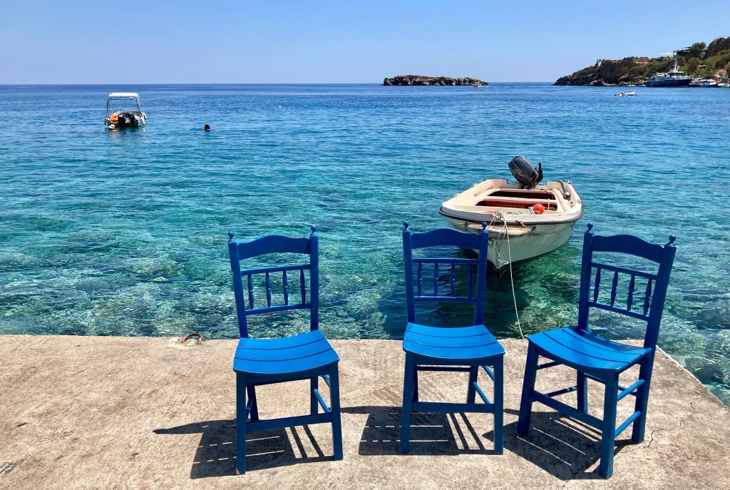 Sestear con esas vistas —y esa ausencia de molestias acústicas— es simplemente una delicia. Llanzarse a bucear por el fondo rocoso de las aguas de Loutró no es menos maravilloso, porque el espectáculo de azules que se da bajo el agua —con la luz jugueteando con el lecho marino— emociona.