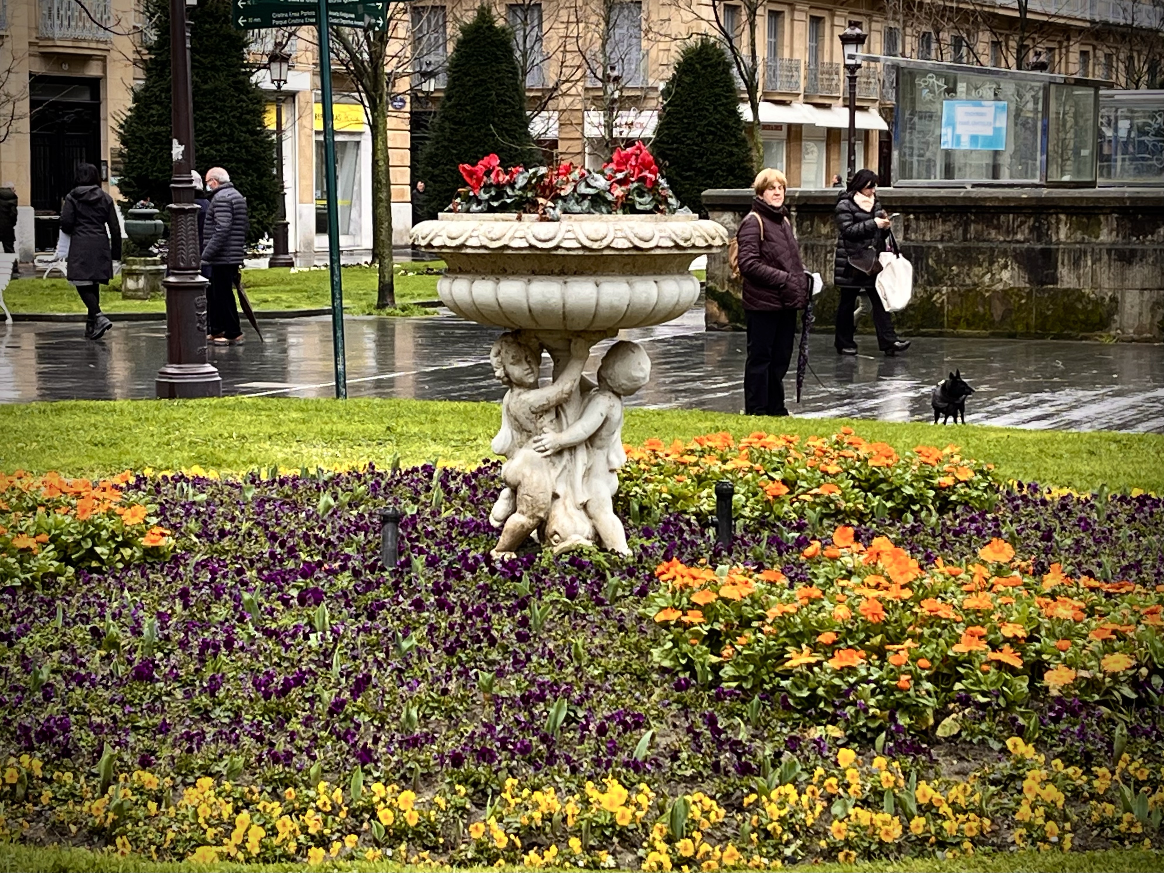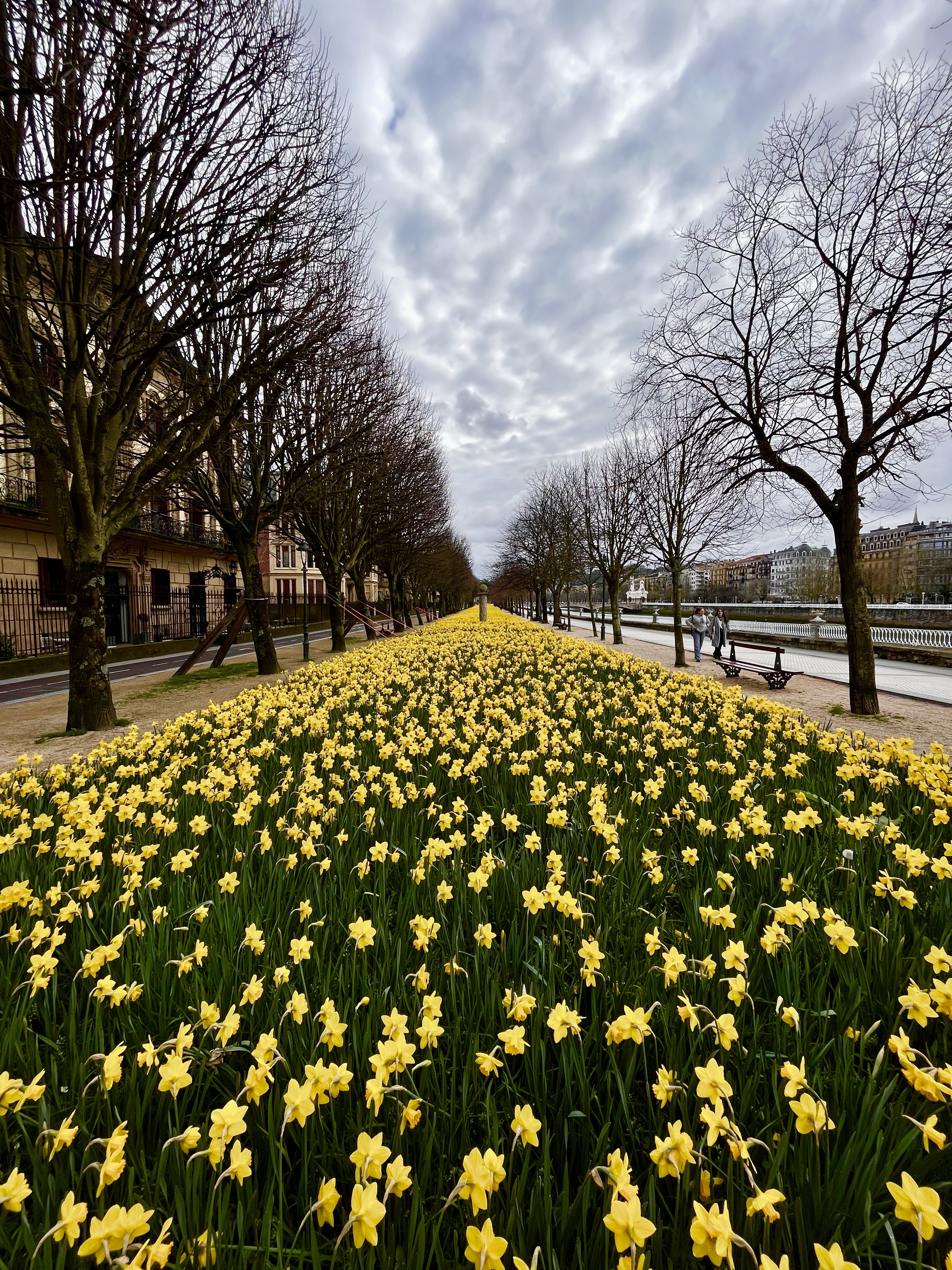 Entre ambos puentes, en la orilla derecha, el paseo del Urumea regala otra estampa made in Donostia: la de los narcisos amarillos perfectamente colocados frente a los palacetes que flanquean la vía.