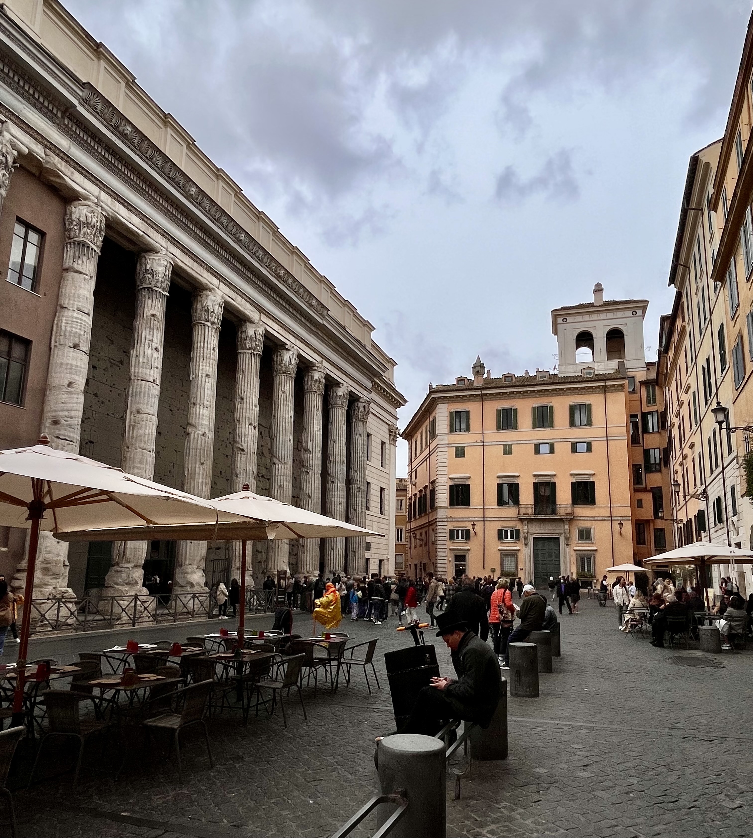 3 | La piazza di Pietra, otro ejemplar precioso de los escenarios de la cotidianidad romana en comunidad donde, por ejemplo, conviene tomarse un vermut frente a las once inmensas columnas del año 145 que te regala el templo de Adriano. Casi dos milenios —se dice pronto— ante ti.