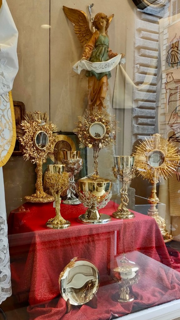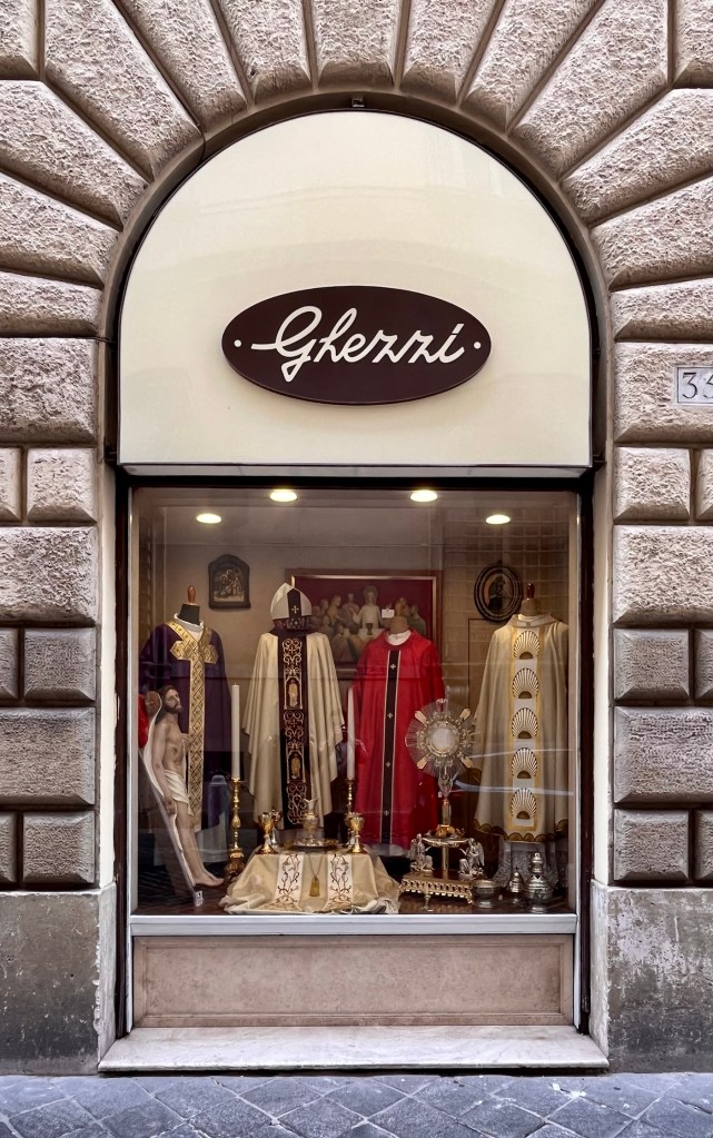 24 | Arredi Sacri Ghezzi (Via dei Cestari, 32), la versión clerical de los bazares chinos, donde comprar tanto una túnica de arzobispo como un gorro de cardenal o un cáliz de plata. Roma es la capital mundial del cristianismo, y también de las tiendas como esta, inimitables en otro rincón del planeta.