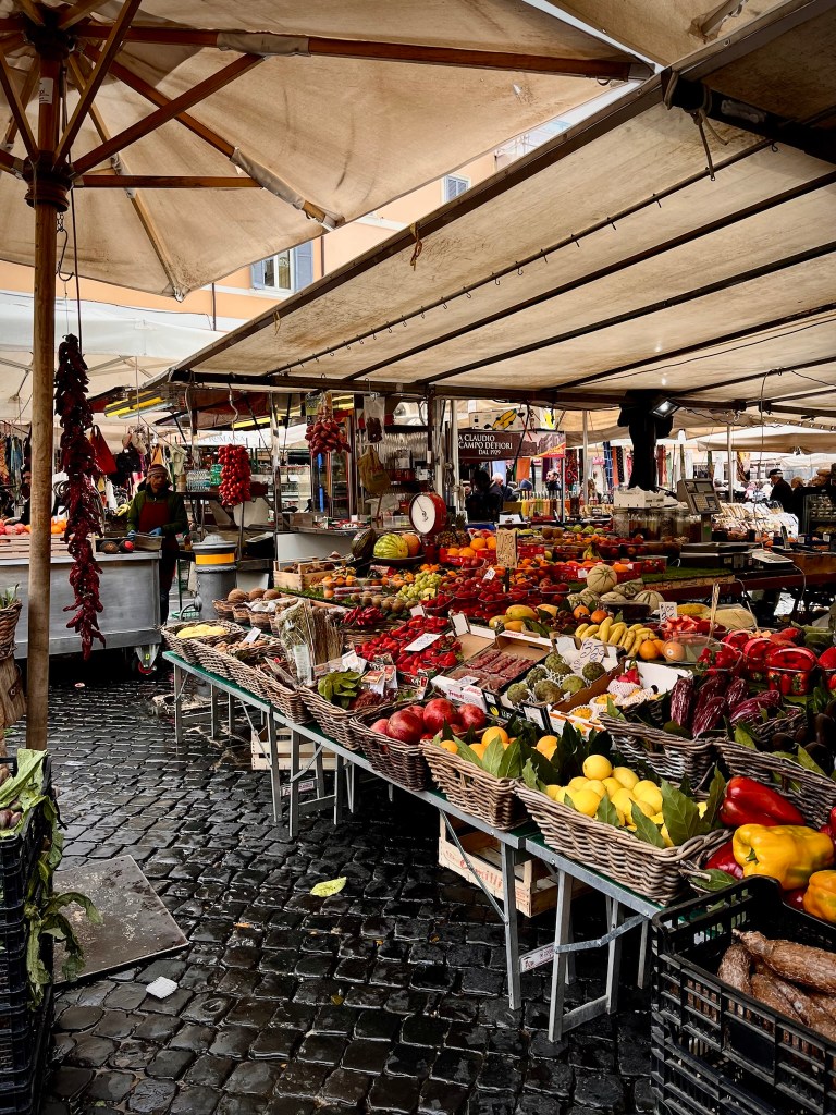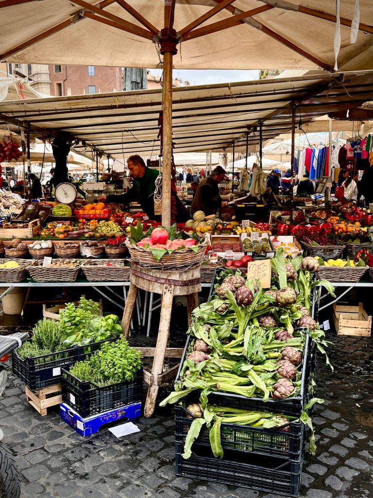 20 | El mercado diario de Campo de’ Fiori y su diversísima paleta de colores, con verduras, frutas y lácteos directamente llegados desde la campiña romana y —descubrimiento— una protagonista ubicua y más romana que Nerón: la alcachofa.
