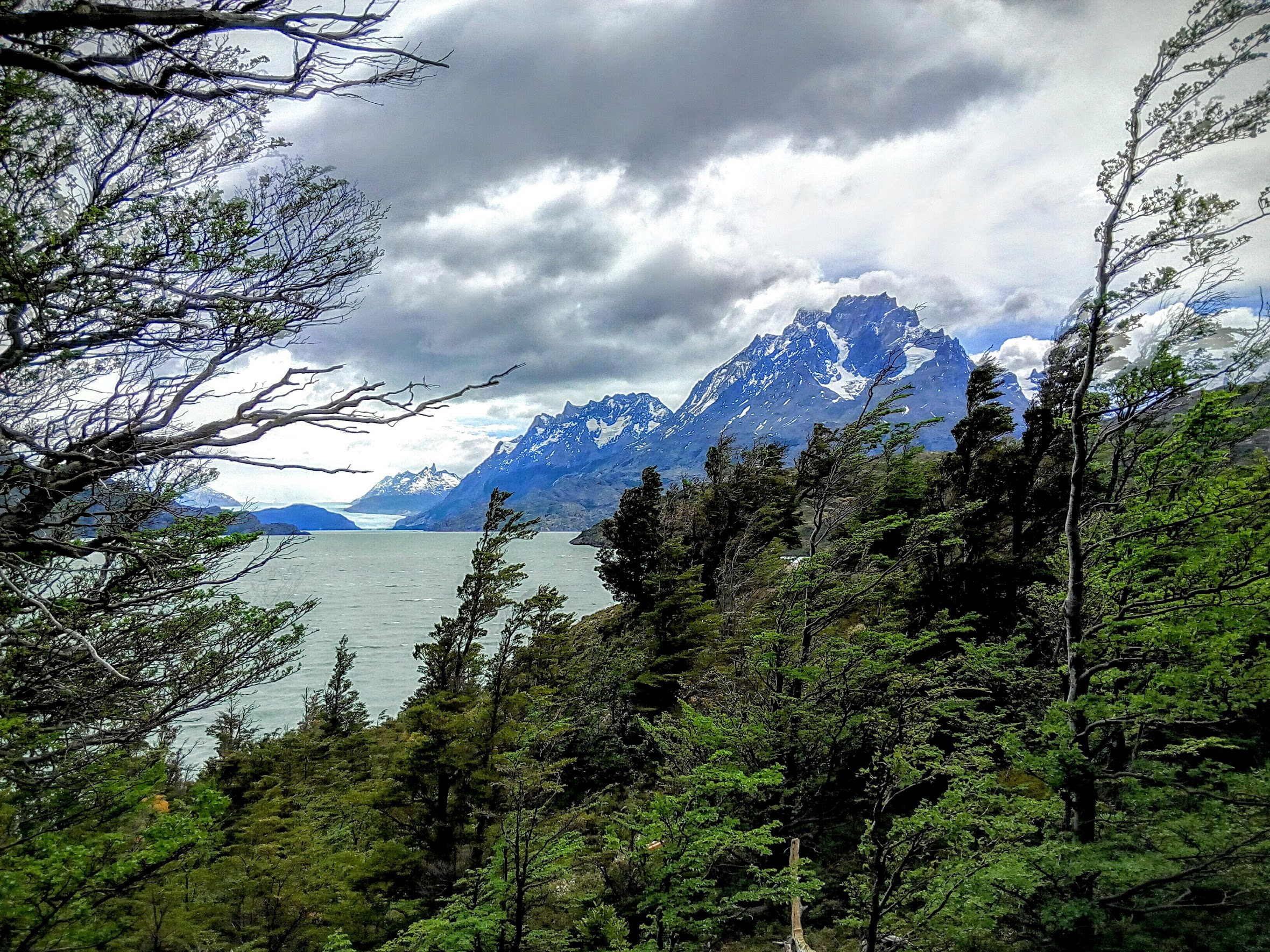 Despedimos Puerto Natales con los primeros vientos y luces del día sobre el canal Señoret, bajo nubes que corren raudas y veloces. Tocan casi dos horas de trayecto entre bosques, cumbres enharinadas, lagos y cielos cambiantes hasta llegar —tras visitar la accesoria cueva del Milodón—a uno de los accesos al Parque Nacional Torres del Paine, la portería Serrano.