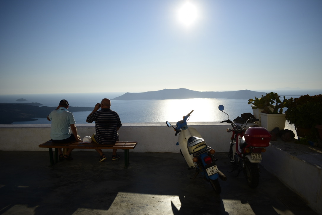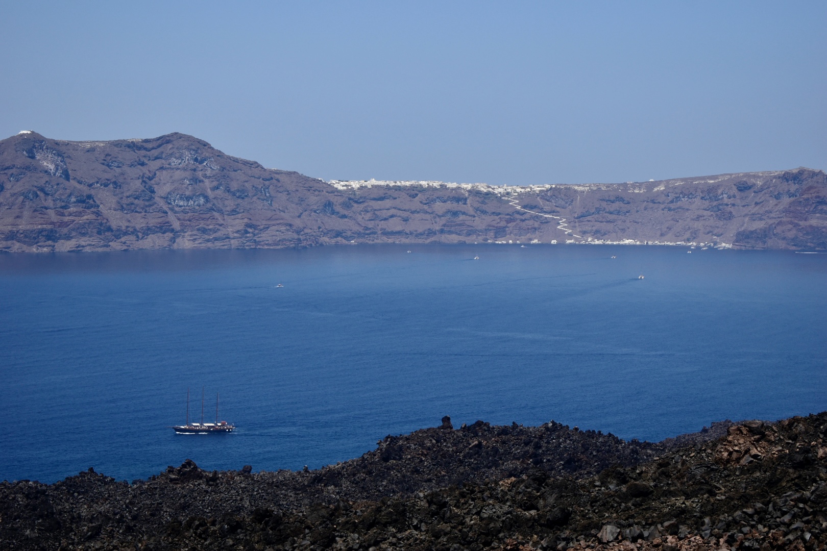 Desde ella se huele el bullicio de Santorini. A apenas dos kilómetros se divisan las casitas blancas y las cúpulas azules de Oia y Fira, amontonadas, desperdigándose desde la cornisa rocosa hacia el Egeo oscuro.