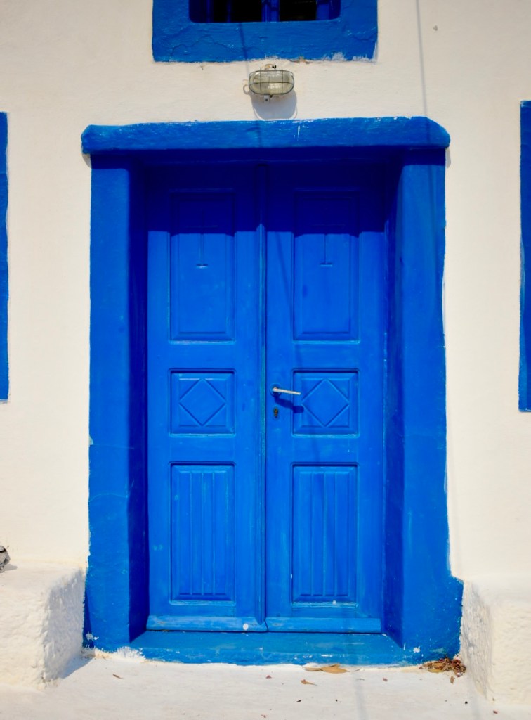 Izquierda: todos los restaurantes del puerto de Korfos tienen ‘veranda’: un piso superior para ver el mar mejor | Derecha: la puerta de la sagrera de la capilla de Korfos.