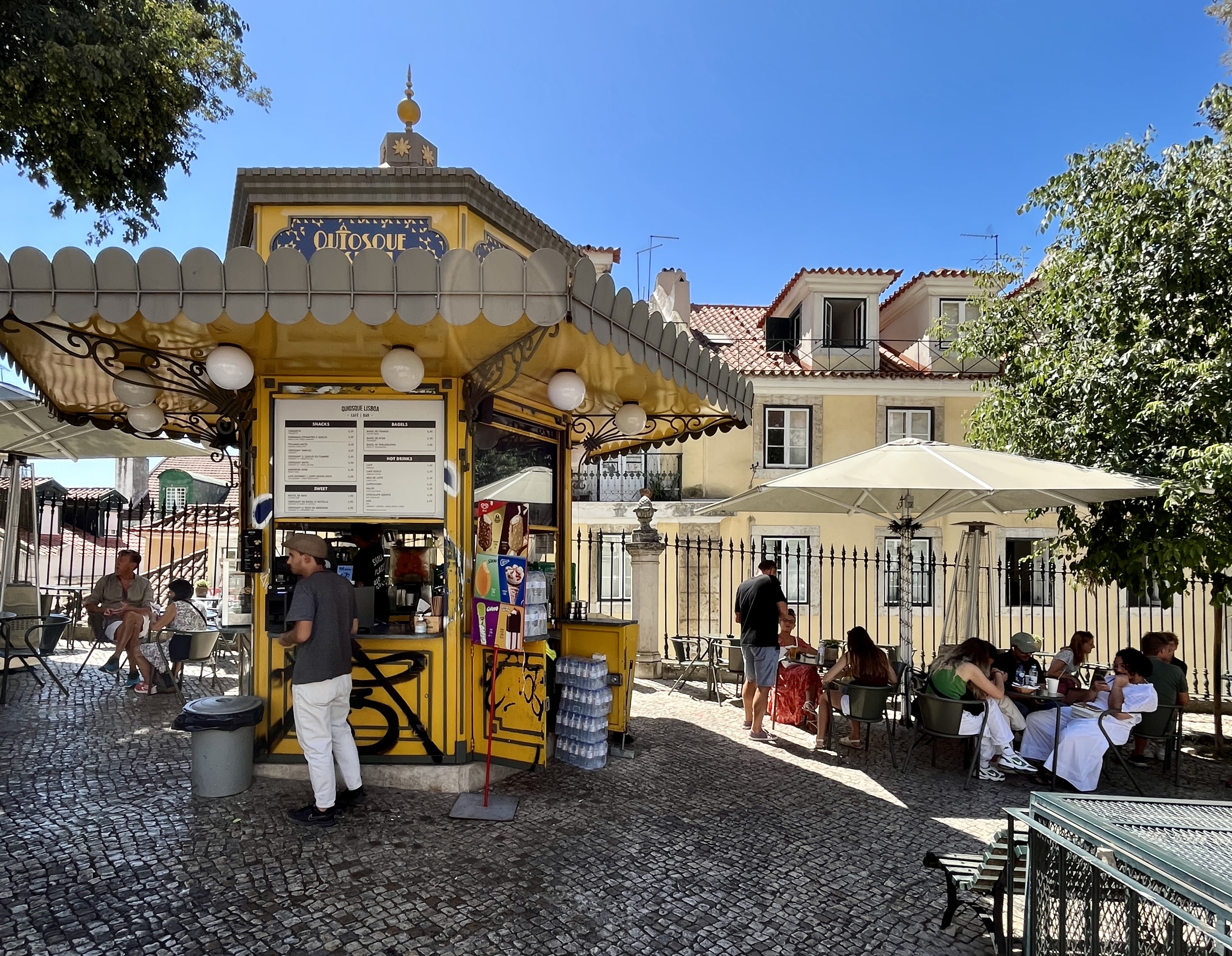 Mientras deambulábamos por Lisboa —no importa en qué barrio—, era imposible no dejar de toparse con los omnipresentes quioscos que pueblan una gran mayoría de las plazas de la ciudad. Juntos, tejen una red de rinconcitos fantásticos para sentarse a tomar el aire y, de paso, detener el tiempo con una cerveza bien fresca o un bocadillo mientras se comparte rato y espacio con los parroquianos, los vecinos del barrio y los visitantes de todo el globo.