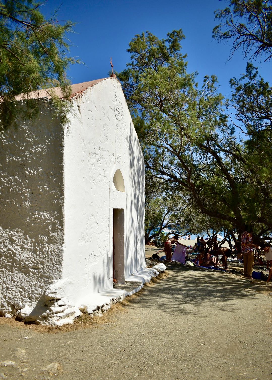 Un buen lugar, por ejemplo, es el entorno de la capilla de Agios Savvas, en el extremo este de la playa. Sus paredes blancas y los arbustos que la circundan dan un frescor y una sombra tan placenteros como necesarios, y será una opción inteligente escogerlos.