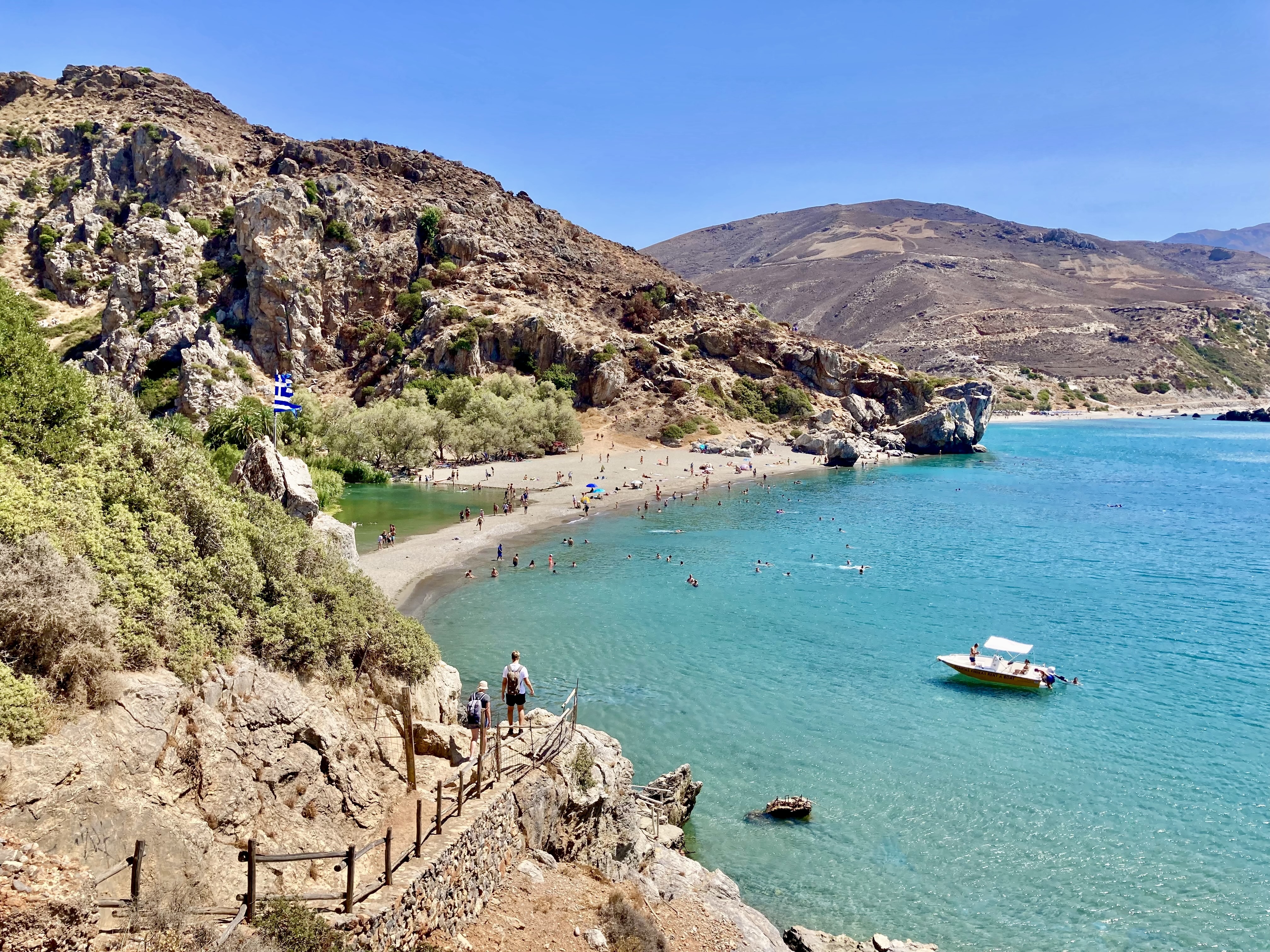 Las escaleras en cuestión son el acceso inevitable y desafiante a la playa de Preveli, a la vez que un mirador sin parangón. Allí abajo se ven, también a tamaño hormiga, todos los elementos que distinguen a este paraje insólito: el Mediterráneo y sus aguas celestes y cálidas, la garganta de Kourtaliotiko que en él desemboca y, en su columna vertical, relucientes y llamativas, la hilera de palmeras nativas —no plantadas, sino allí crecidas— que, bordeando al río Megalopotamos, conducen hacia el mar como si fueran una pista de aterrizaje.
