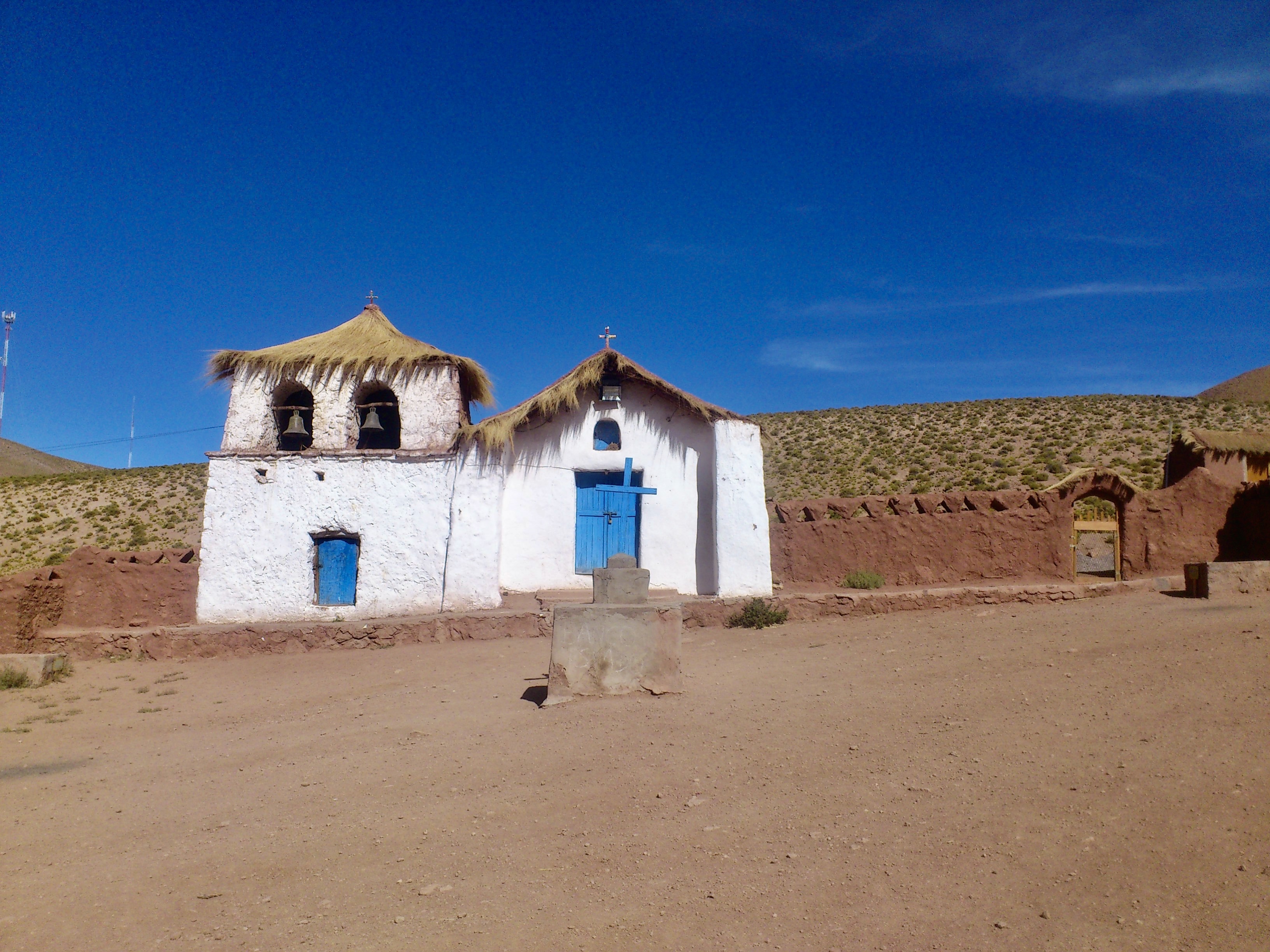 4.115 metros de altura. Es el hito que marca la iglesia de Machuca, perdida en la inmensidad del desierto a unos 30 kilómetros de distancia de San Pedro de Atacama, en Chile. Su campanario bajo y aplastado parece haber capitulado ante el mal de altura, ¿y quién no lo haría? Con sus puertas azules y sus techos cubiertos por paja, el templo rezuma entrañabilidad en un medio árido, duro y despojado, en ese incierto y bellísimo cruce de caminos y texturas entre la frontera chilenoboliviana, los volcanes andinos y los humeantes géiseres del Tatio. Pura magia hecha paisaje.