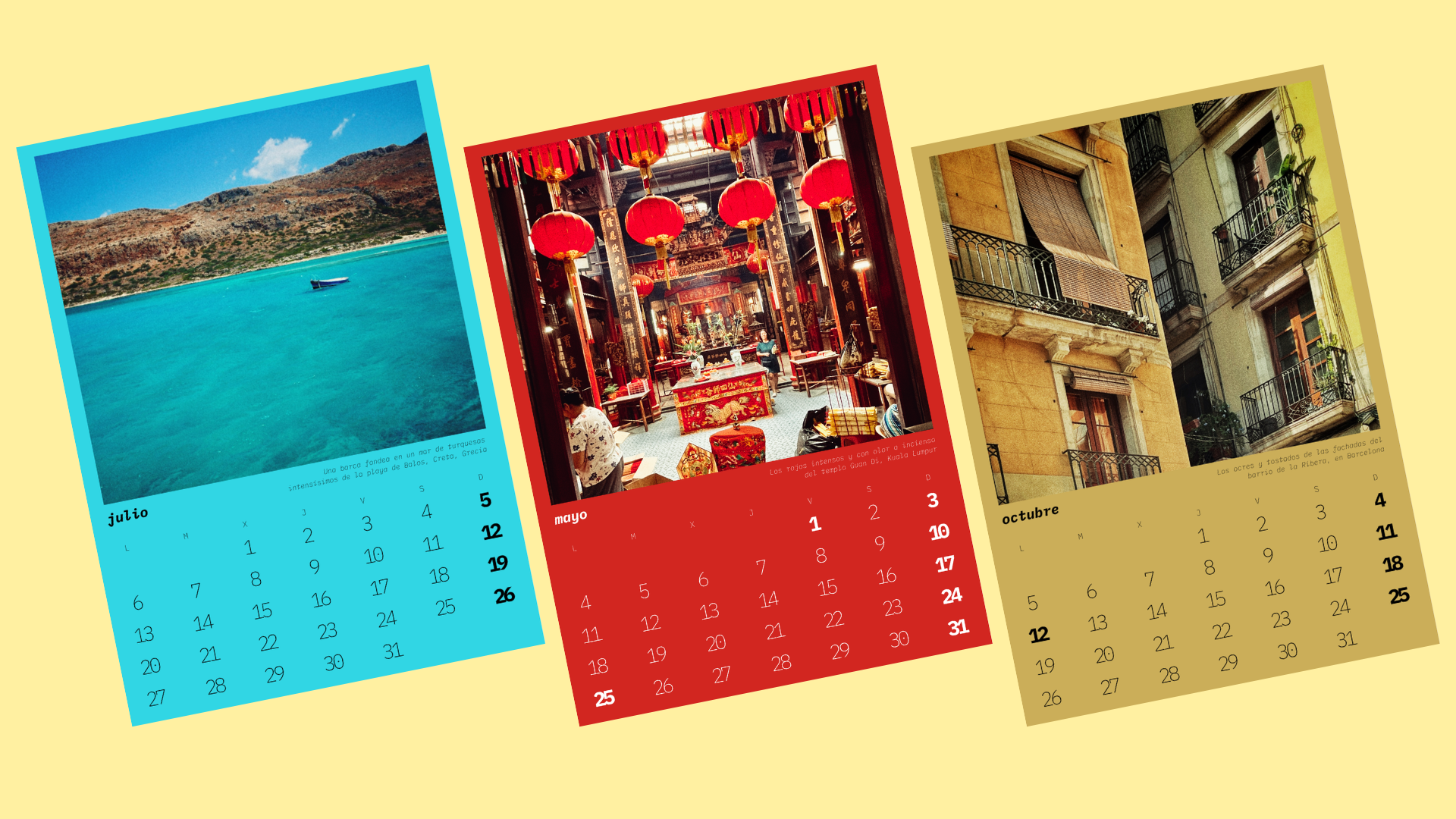 La sexta edición del calendario más viajero recorre el mundo en esta ocasión a través del hilo conductor de los colores: desde el verde húmedo y laberíntico de los arrozales de Bali hasta el negro profundo de las playas islandesas, pasando por el icónico salmón del Cine Doré de Madrid o el azul infinito de la laguna Chaxa, en el desierto de Atacama. Porque en un mundo a veces tan sombrío, pesaroso y convulso, si hacemos el ejercicio simple y gratuito de detenernos en los colores que nos rodean, quizás seríamos todos más felices. Y más empáticos. Y más pacíficos.